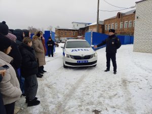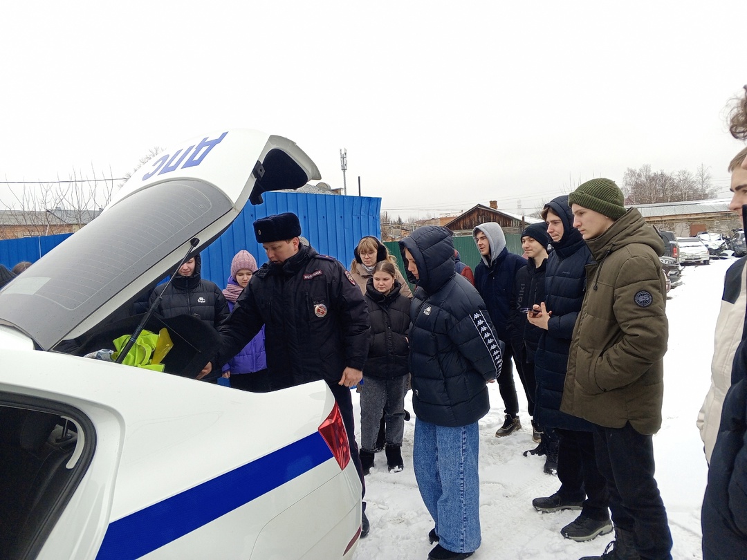 Экскурсия началась с посещения ГИБДД. Автоинспектор рассказал школьникам о своей службе. Большой интерес у ребят вызвал патрульный автомобиль. Подросткам показали оснащение патрульного автомобиля ДПС, продемонстрировали работу проблесковых маячков и сигнально-говорящего устройства.