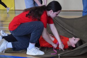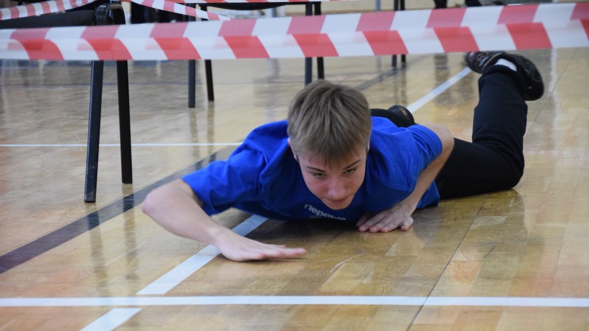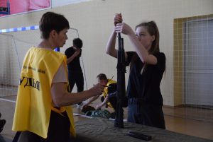 После инструктажа участники прошли полосу препятствий. Первому из команды предстояло надеть общевойсковой защитный костюм с противогазом и передать эстафету следующему участнику команды, который должен был собрать автомат. Далее школьники ползали по-пластунски, бросали мяч в цель, а на завершающем этапе оказывали первую медицинскую помощь.