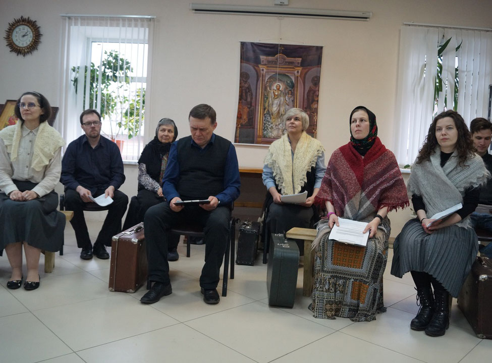 А 13 апреля в православном просветительском центре снова были гости – участники Преображенского братства из Рязани. Приехали, чтобы с помощью театрализованного чтения рассказать историю Церкви в XX веке глазами одной московской общины. Представленная ими литературная постановка «Близкие люди. Далёкий путь» – это чтение глав из книги Архимандрита Сергия (Савельева), написанной им на основании писем и дневников людей, состоявших с ним в одной общине, благодаря которым нам даётся возможность восприятия событий того времени через эти письма. Пред нами предстала некая реконструкция происходивших в нашей стране событий в 20-30-х годах прошлого столетия. Арестованные члены братства не впали в уныние, не зароптали, поддавшись общему настроению, царившему в тюрьме, не утратили веру в добро, они интересовались жизнью друг друга и поддерживали отчаявшихся сокамерников. Они сплотились, продолжали молиться.