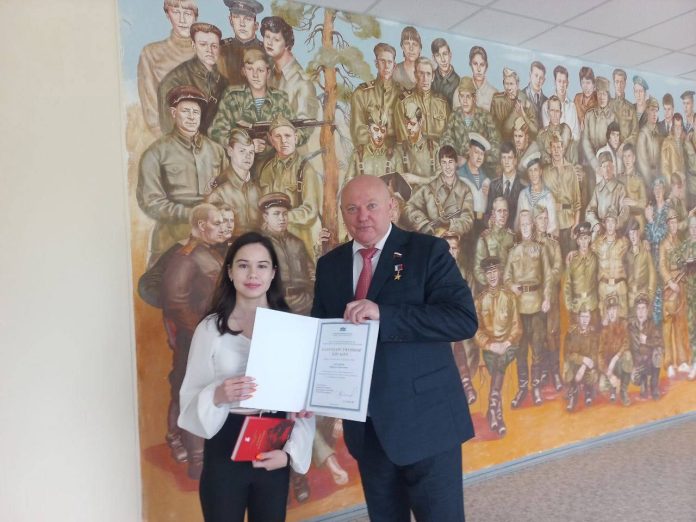 Андрей Красов вручил награды активистам школы, которые занимаются патриотической работой, краеведением, участникам регионального конкурса сочинений «Без срока давности».