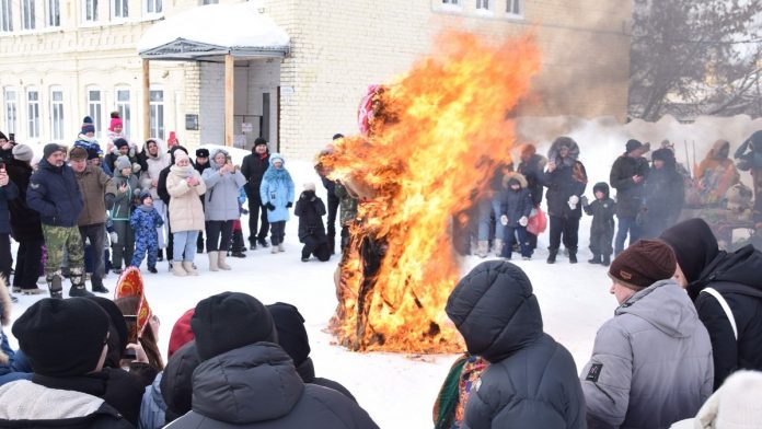 21 февраля в Спас-Клепиках провожали зиму. В сквере на улице Есенина артисты центрального Дома культуры пели, водили хороводы, играли с гостями праздника в игры.